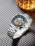 صفحهی توخالی این مدل، جزئیات مکانیزم را بهطور هنری نمایان میکند و برای افرادی که به طراحیهای خاص علاقه دارند، گزینهای برجسته محسوب میشود. طراحی بند فلزی یا چرمی قابل انتخاب بههمراه سبک و لوکسی ساعت را کامل می کند